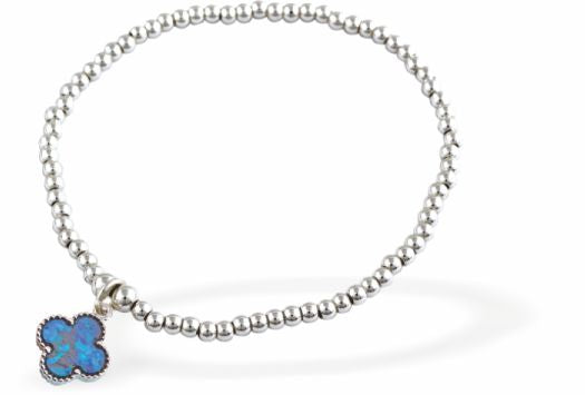Stretch Bracelet with Silver Coloured Beads, Rhodium Plated, with Paua Shell Clover Charm