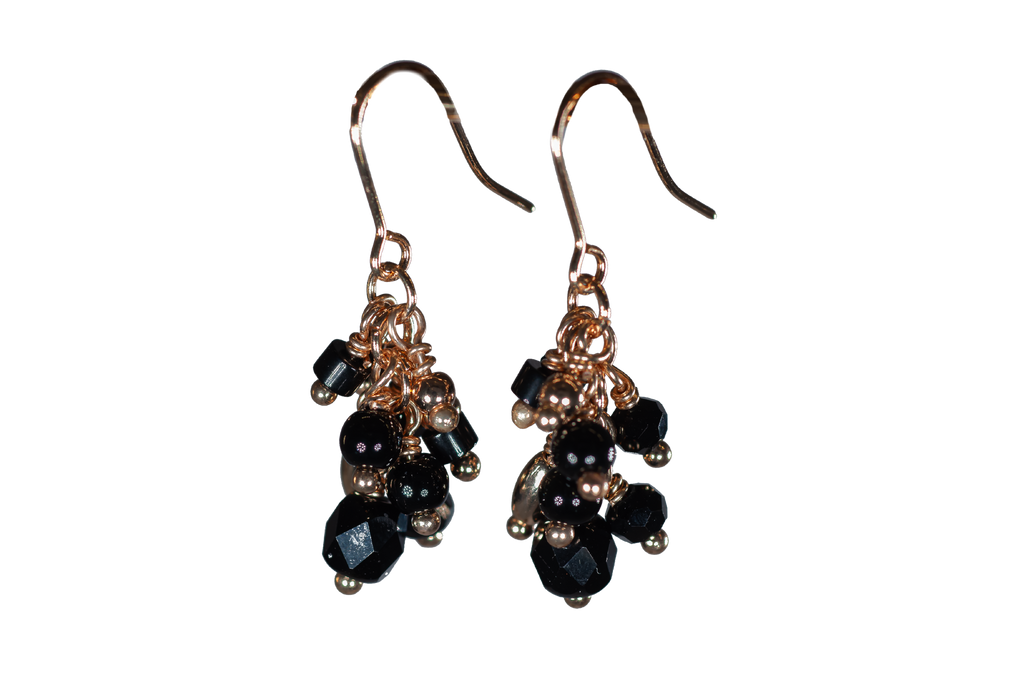 Multi-beaded Black Drop Earrings, Gold Coloured Fish-hooks Rhodium Plated