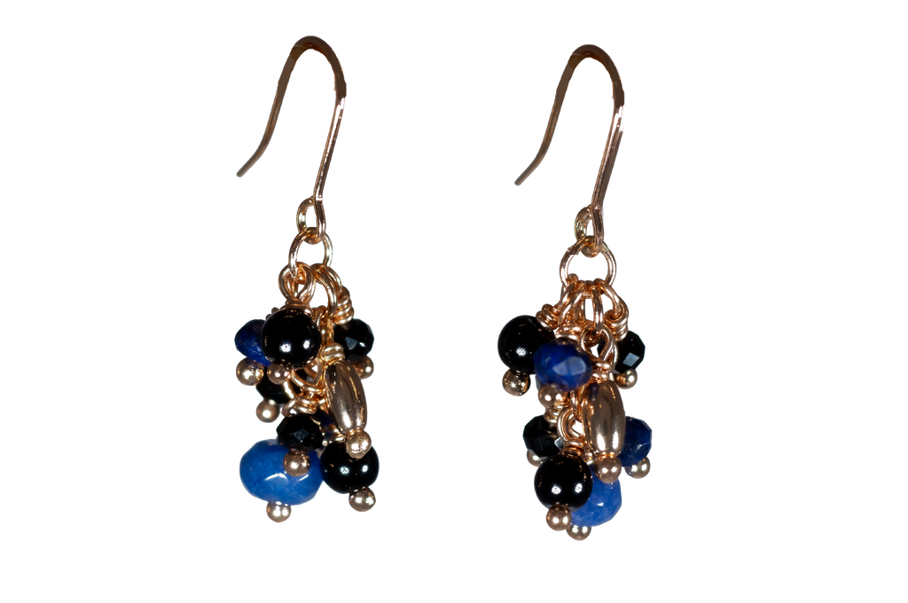 Multi-beaded Blue and Black Drop Earrings, Gold Coloured Fish-hooks Rhodium Plated