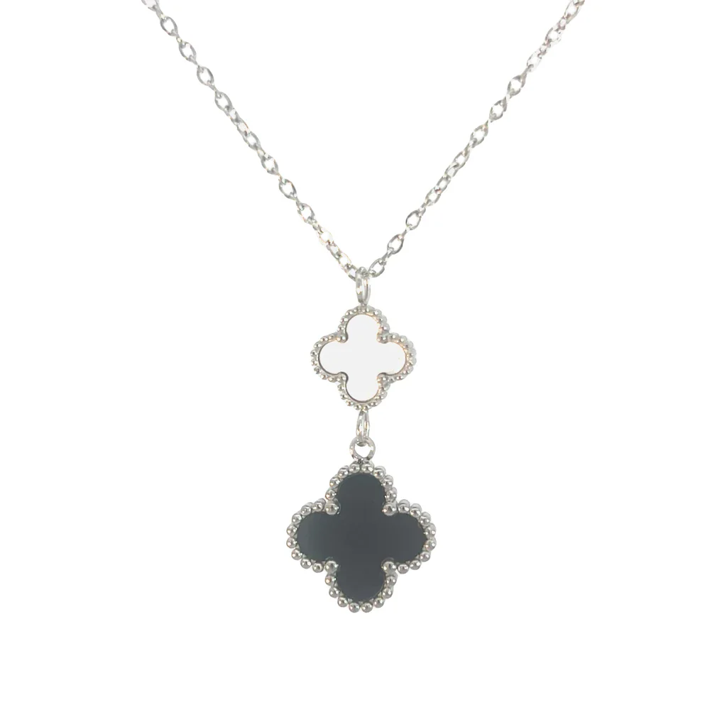 MP81 - Doube Drop White & Black Four Leaf Clover Pendant Necklace, Silver Coloured