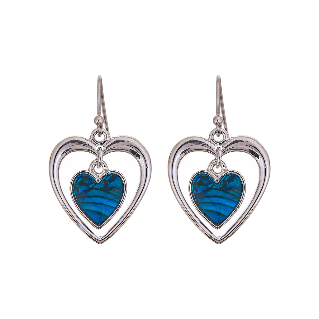 Paua Shell Heart within Heart Drop Earrings, Rhodium Plated